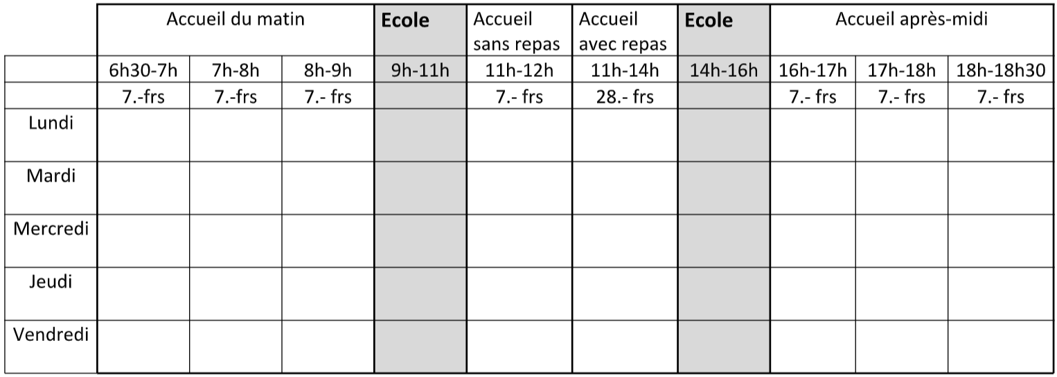 Accueil 9h-16h / 2 jours par semaines : 448.- mois